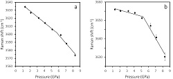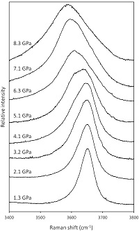 ![]() 図1. 格子振動の圧力依存性 ![]() 図2. OH伸縮振動の圧力依存性 ![]() 図3. OH伸縮振動数の圧力変化 |