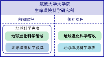 生命環境科学研究科「地球進化科学専攻」は、平成19年度より5年一貫制から区分制に移行しました。博士前期課程として「地球科学専攻」が開設され、「地球進化科学専攻」は博士後期課程となりました。ここで、「地球科学専攻」は、主に二つの領域「地球環境科学領域」と「地球進化科学領域」に分かれています。博士後期課程では、前期課程の「地球科学専攻」の学問領域は、二つの専攻「地球進化科学専攻」と「地球環境科学専攻」に分かれます。